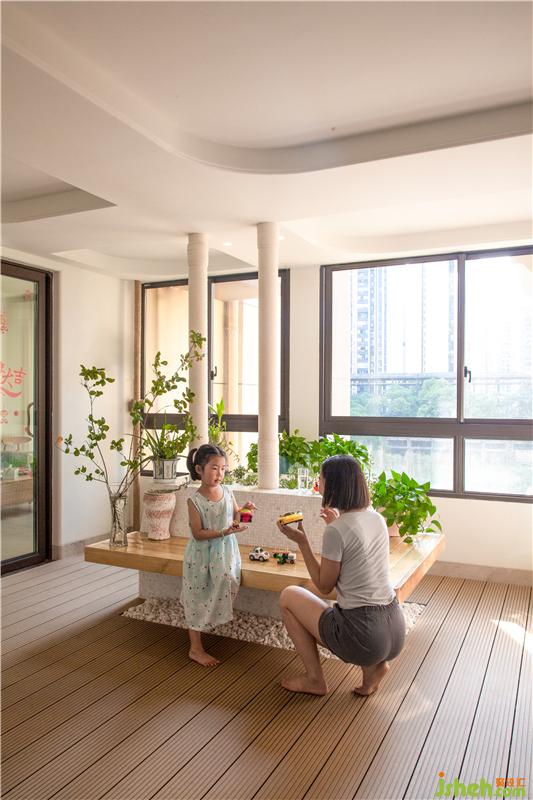 能在霓虹之间穿梭流淌,也能在小院里看绿植尺寸生长观察四季变换,感受生机盎然。一方花园链接着两个小主人与大自然的亲密关系 温润质朴的塑木地板与地砖区别开来圈出一块,可以随意落脚的自然乐园肌肤所及,也变得友好亲密。