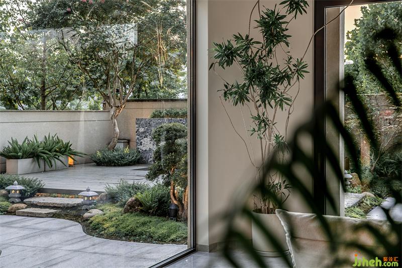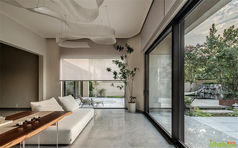 自入户门厅步入住宅,花墙端景令人眼前一亮;重庆别墅装饰对称构图彰显平稳之感,与池中的潺潺流水、跳动鱼群对比。
