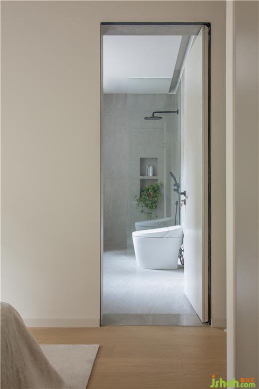 卫生间冷灰瓷砖、大理石台盆、柔软地毯,