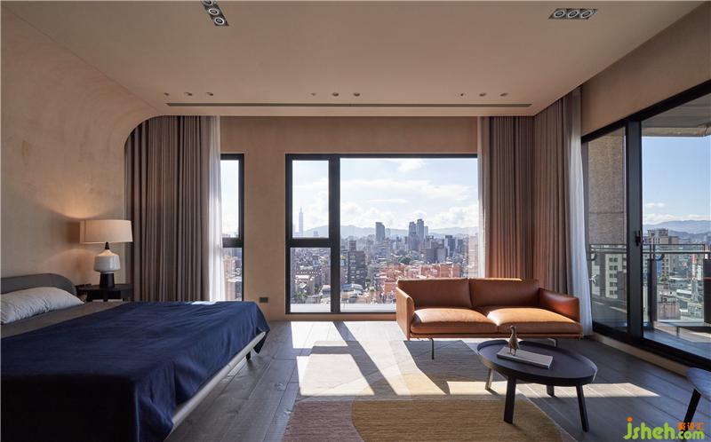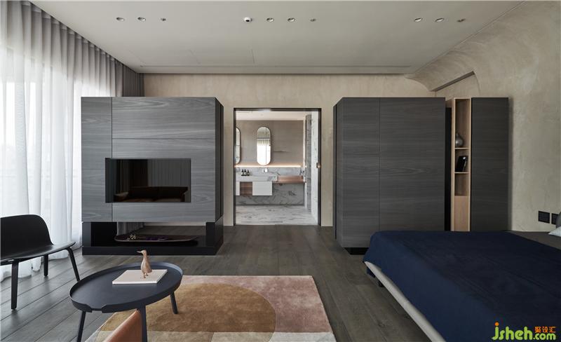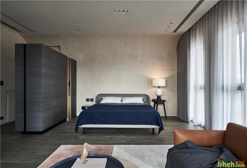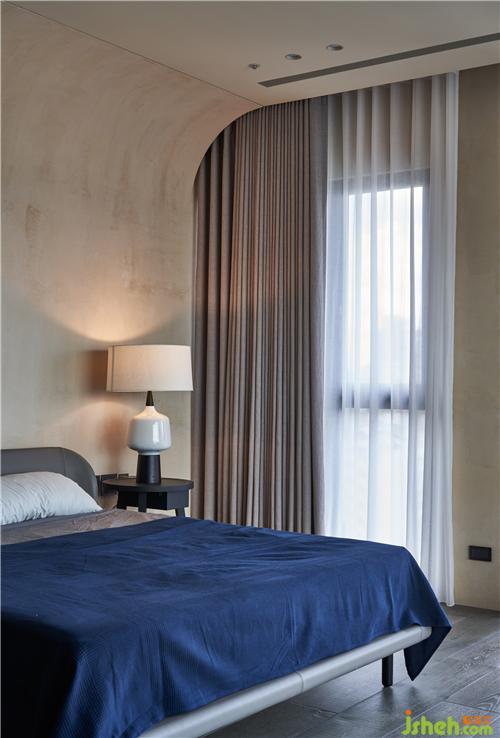 经由不同角度,客厅弧形天花反而向上延伸,呼应远方的山色悠然与寂静,亦增添了空间的宽敞与静定。主卧床头墙,延续弧形元素延续至天花,使其忽略空间压梁问题,并提高广州装修设计空间高度,弧的造型也形成的静定的心灵感受。