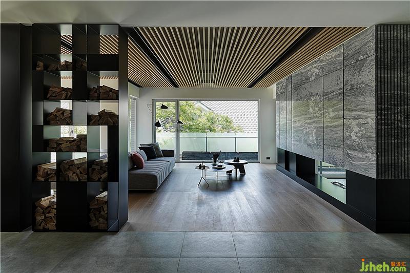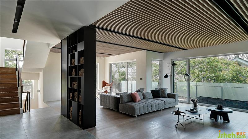一列黑铁格柜,定义走道与客厅的分界,亦修饰结构柱,柜体活泼的几何韵律,赋予视觉愉悦的通透与律动北京装修设计。