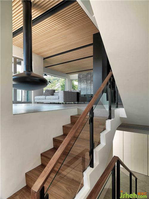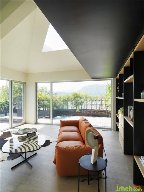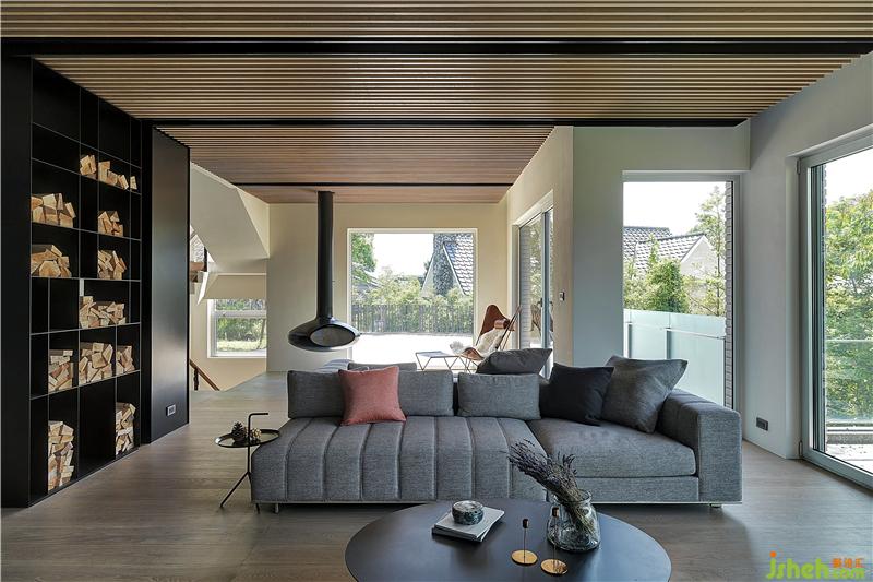 近窗处悬吊一座烧材壁炉,作为空间的温暖象征,犹如雕塑品般的地伫立于空间之中。