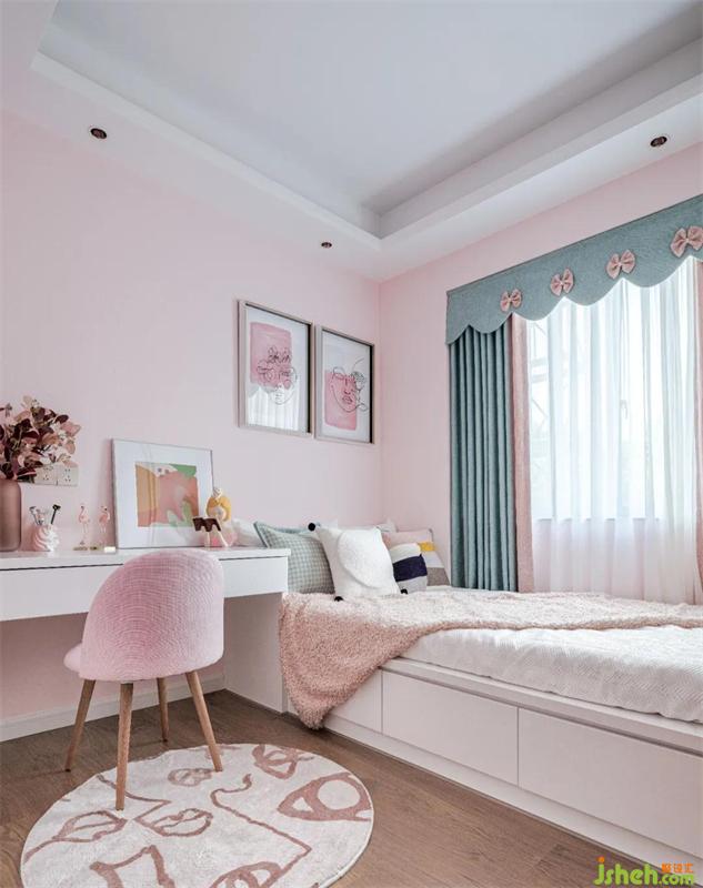 女孩房由马卡龙色系温馨且单纯的色块来组成,
