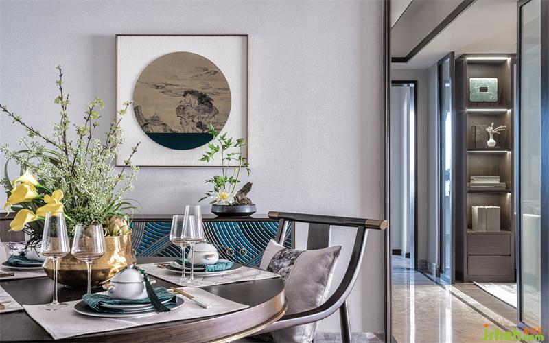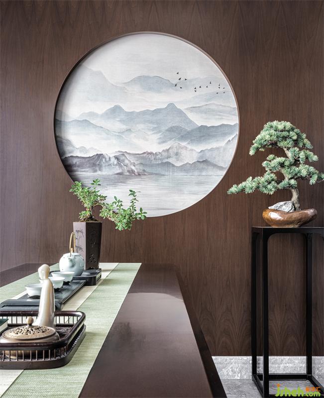 餐厅一脉相承于古朴素雅的文化底蕴,圆桌团聚谈笑,还可欣赏像是透过圆窗看见的远处美丽山水。