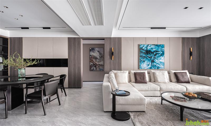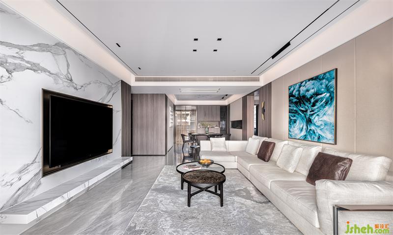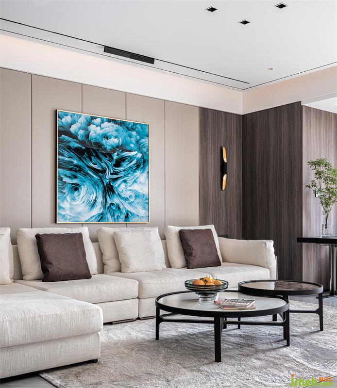 客厅空间整体基调都以素色雅致为主,开阔的空间布局带来了极佳的视野和光线,把景观阳台纳入客厅使用,增加了客厅的通透性,极简空间里点缀着一小片靛蓝,随着阳光消隐,室内会愈发清简而开阔.