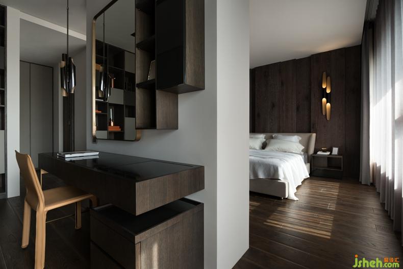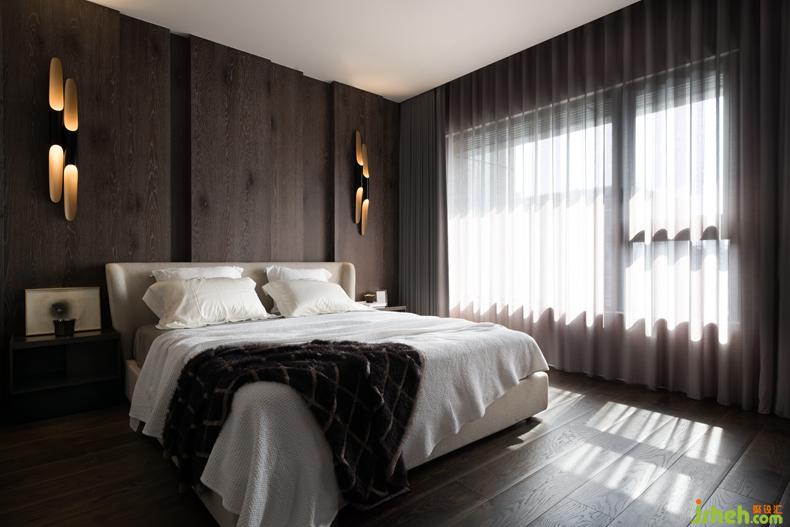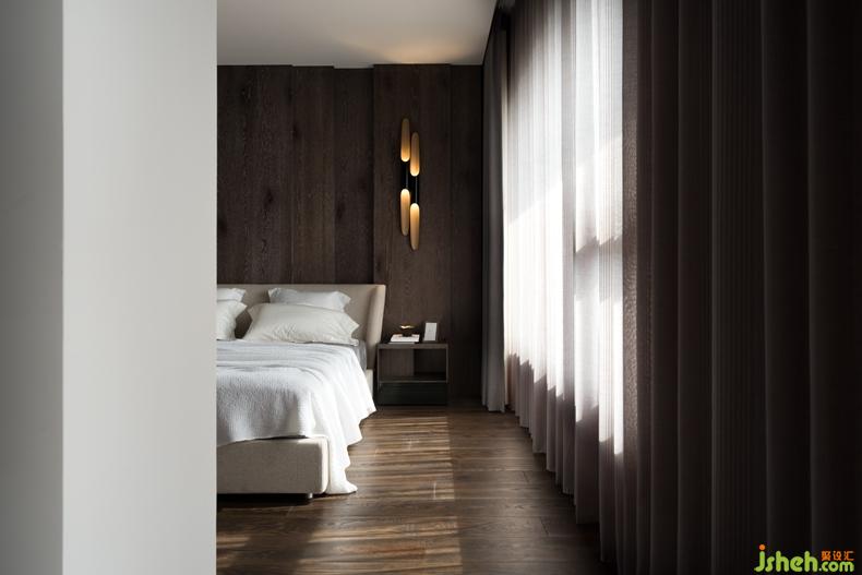 主臥室善用床尾視聽牆當分區介質,增設專屬更衣間機能,視聽牆正面採皮革軟繃,縱向的分割線條,恰與床頭牆面立體堆疊的木質板塊相呼應。