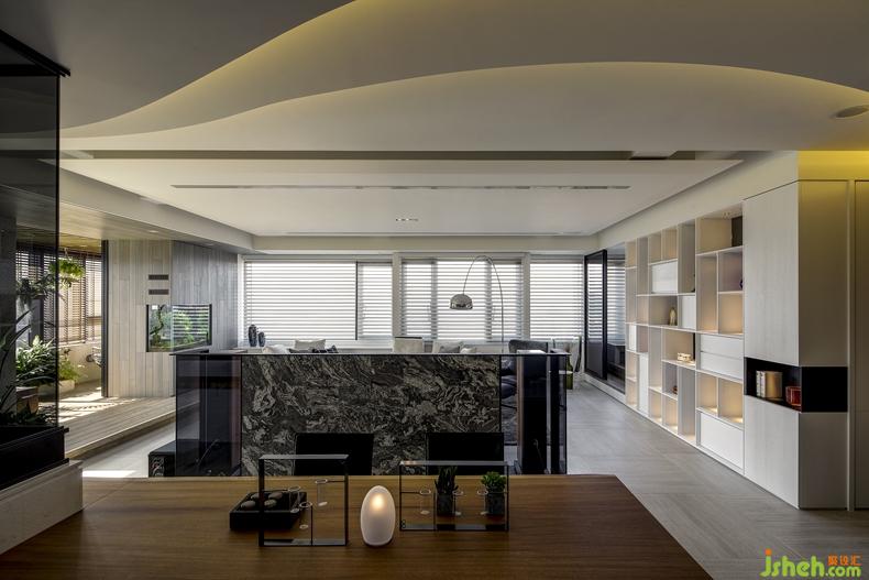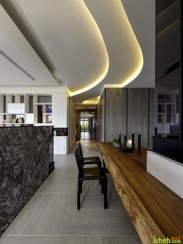 将设计的语言转译为不拘泥的生活对话,在流动的空间映象里,天花层次漫延并转化演译成曲度的水纹肌理,抽象的解译自然而然的隐敛,在媒材、在表情、在虚实、在光影中,静默不语…
