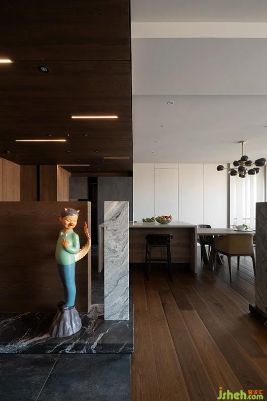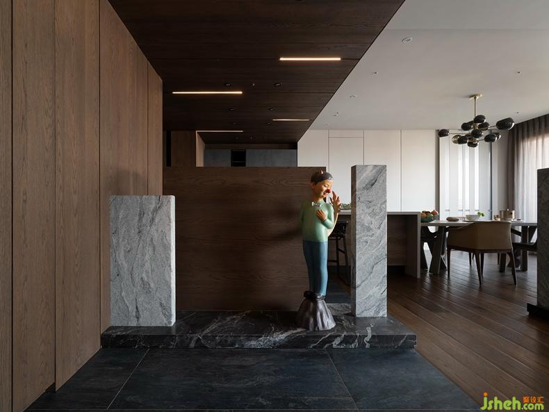 Serving important purposes in the public space, three fixtures standing half way up the wall in height boast of different functions. The first unit, installed in the entryway and carving out a sense of division between the interior and the exterior, serves as a greeting sight for guests who enter the door; the low matrix-style cupboard, fashioned with both wood and stone, provides an exquisite sensation and oozes a charming air. The second unit, forming a semi-wall on the back of the TV set, extends the lines and wood-stone texture from the living room creating an impression of variety. The bookshelf space embedded on the back of the wall quietly adds a literary atmosphere to the dining room. The third fixture serves as a multipurpose axis connecting the island counter with a sink and the dining table. In addition to being highly functional at dinner parties and banquets, it is a focal point for socializing, relaxation, and parent–child interaction.