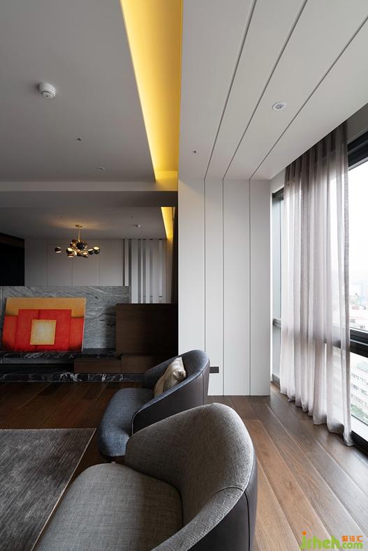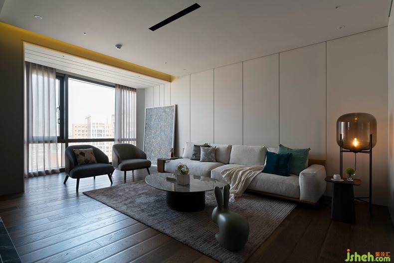 客厅区简敛明净,刻意简化层次与线条堆迭的天花板,本质相对轻盈,而沙发背墙与餐厅背墙两面相呼应的留白与线性分割,适度阐述沉淀之功,并满足放大面宽、强化比例平衡、整合房门动线等潜目的。极度干净的场景,最能回馈人在空间中的移动、停驻、相互交流的温度,偶而将视线移向餐桌外阳台的蓊郁绿影,心灵随之平和净化。