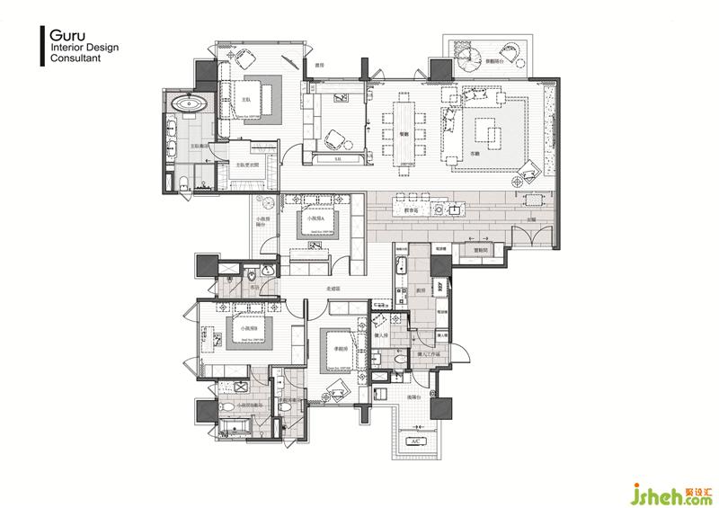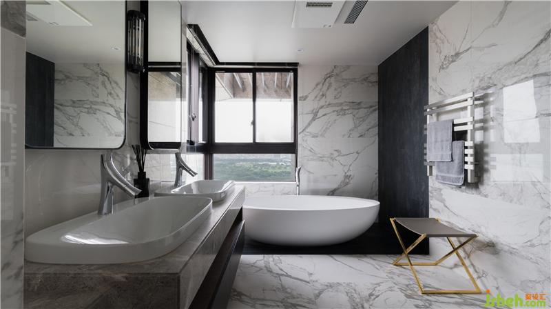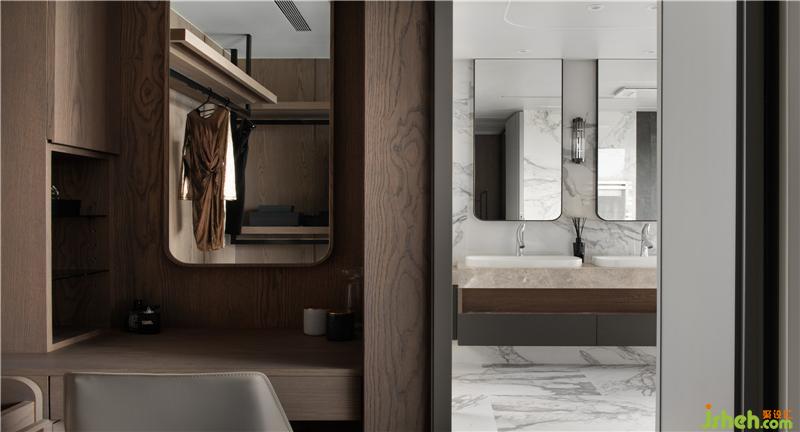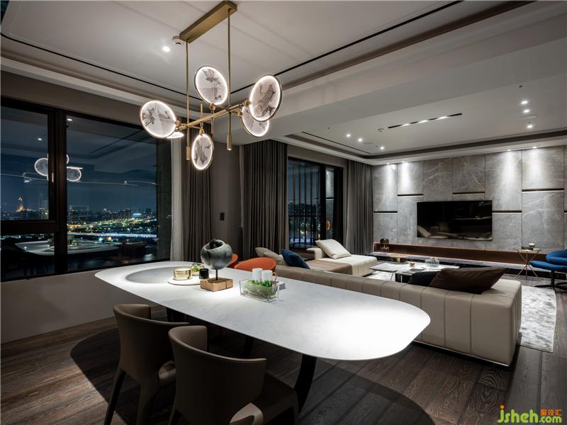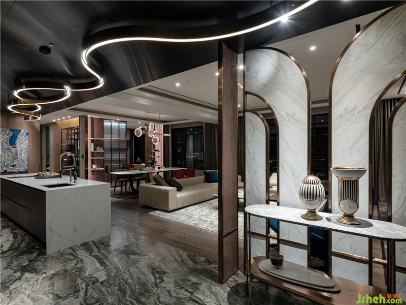 全案游移在俐落现代基底与新东方古典的悠远之间,首先电视主墙简敛却不失活泼律动的线性架构,交织不同材质的错层堆叠与温润,悬垂于餐桌上方的铜金色灯饰,四向开扬的圆形扇片以透光石材制作,激似水墨画的肌理,流露古诗画特有的文人浪漫。此外,以屋主英文姓氏发想的¼圆弧角语汇,也成为赏翫全案的关键线索,包括公领域分区天花板造型,兼顾精致间接照明和隐匿梁下差的积极目的,另外还有悬置于书房入口两侧的金属层架、浴室挂镜、面盆、镶嵌于天花板的特殊霓虹矽胶软条灯带等等,都能深刻体现圆弧语汇所代言的专属性与尊荣感,而通往私领域的廊道也特地扩张至120cm宽,侧向展示柜强化视觉深邃,幅宽则确保长辈行进间的舒适尺度。装修公司