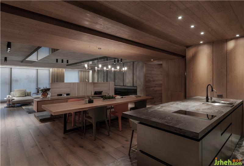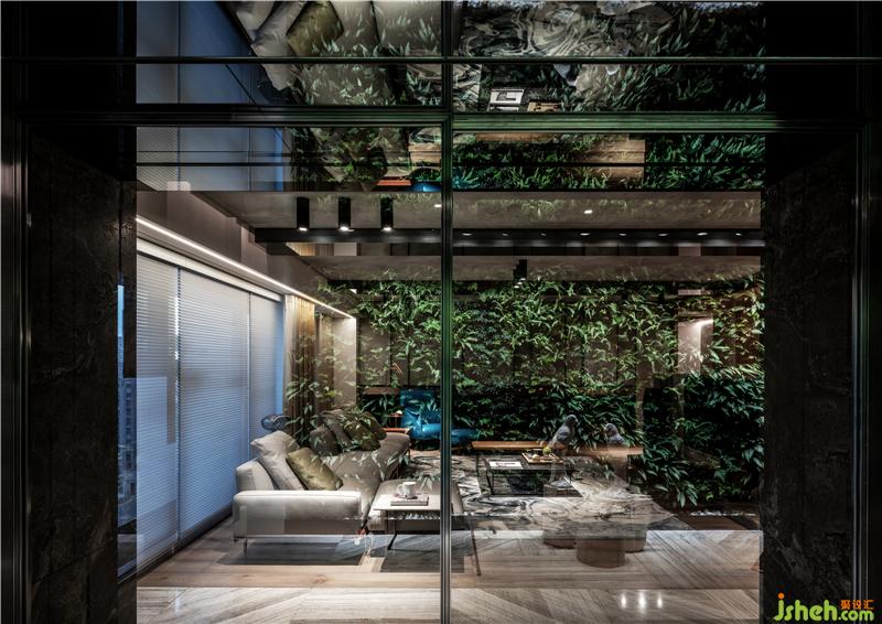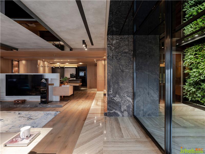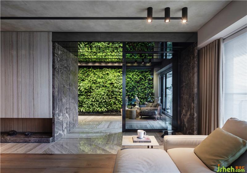 全宅虽拥有三面采光的大户优势,但进门玄关处却明显偏暗,因此我们打造一整面植生墙,营造一回家便如同走入一座森林、大反差的情境惊艳引人入胜,实作上并搭配灰镜天花板,加上色温接近天然光的照明计画,一举突破暗区限制,成功借凸显大面植生墙的蓬勃绿意,热情迎宾也酝酿场域包容力,地坪则选用质朴木纹石,精工裁成不同大小、纹理行交丁错拼,于极度和谐舒服的暖调中,释放宛如置身大自然的疗愈氛围。装修公司