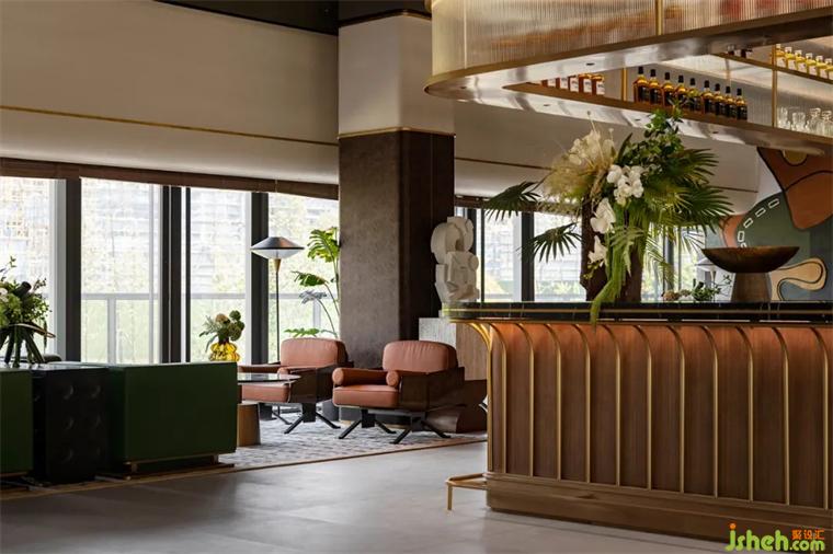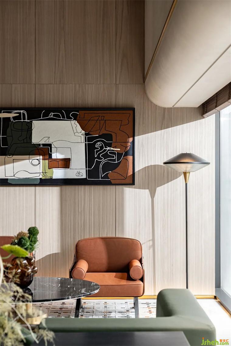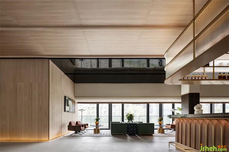 木饰墙顶延伸至天花,相同的材质运用了不同的切割手法,呈现出不一样的样貌,亦保持了整体的一致性。