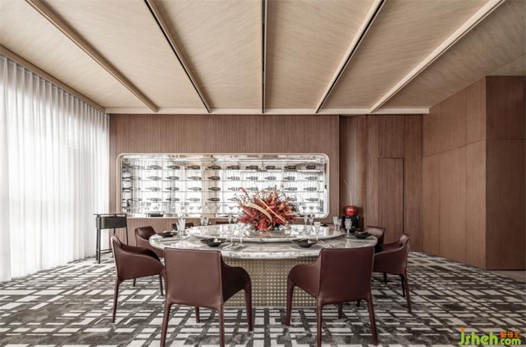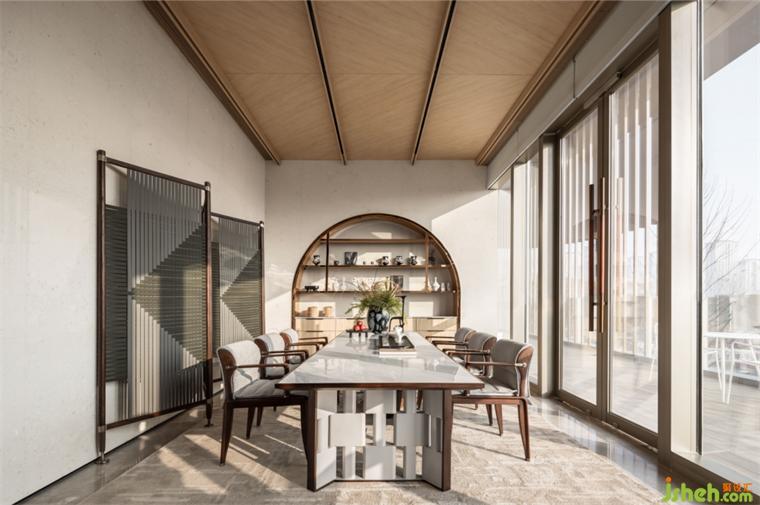 咖啡与茶是人们日常生活中颇为重要的部分。“吃茶去”“饮茶先”的网络用语里蕴藏着古人对茶的钟情之意。茶水雅淡,因此在器物的选择上不宜过份鲜妍,光是为了传递茶之美,饮茶之闲适淡然,售楼处设计就必须在设计中独具几份心思与创新。为了彰显“空”的精神,特意选择具有镂空特质的屏风与茶桌,传递出茶室的空间意蕴。