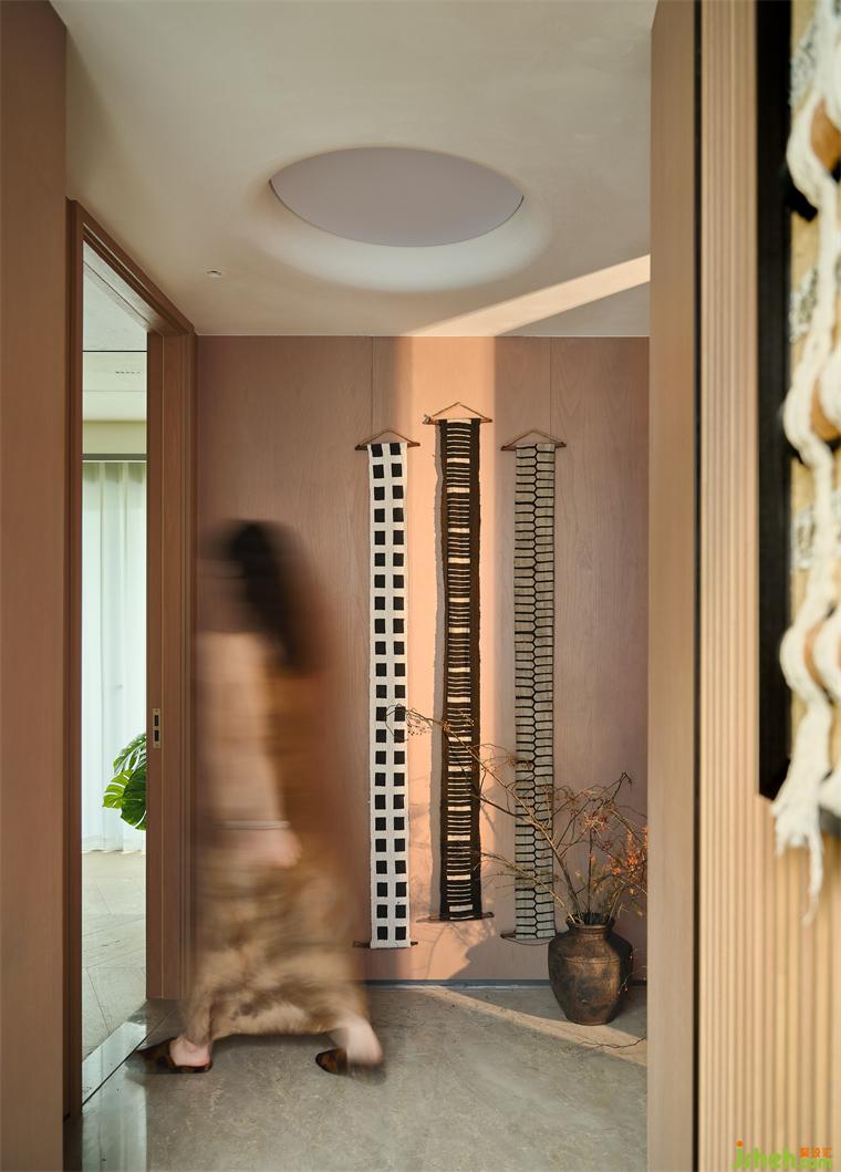 阳台则打造成一片轻松惬意的小憩之地。鸟笼悬挂在空中,样板房设计增添了几分灵动与自然之美。尤为引人注目的是那幅编织而成的挂画,其独特的质感与纹理细腻地诉说着生活的温度与匠人的巧思,使得这片小天地充满了浓厚的艺术气息和生活情调。