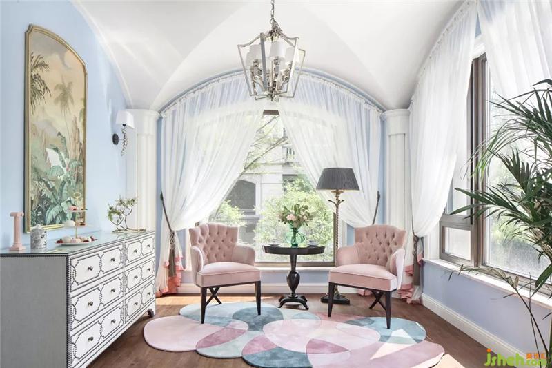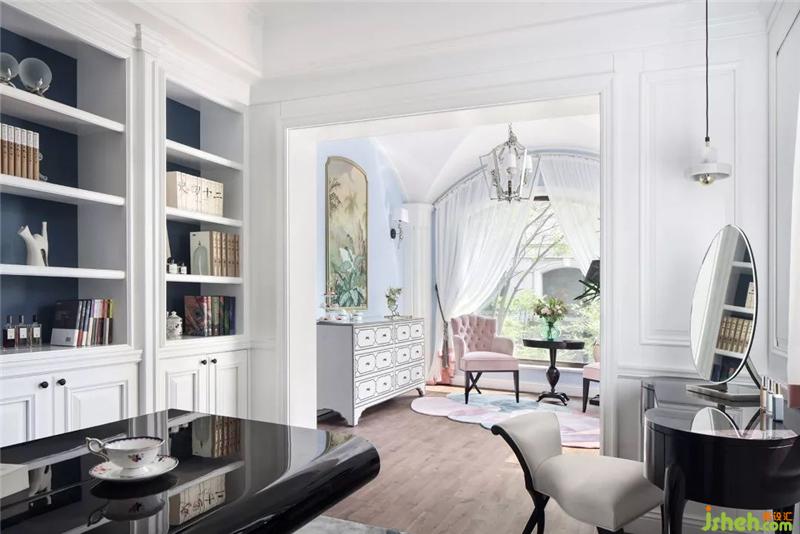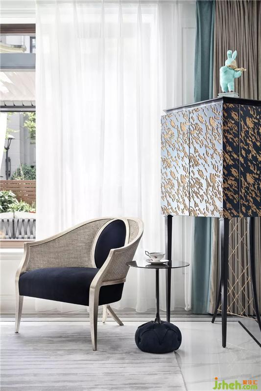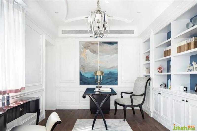 书房与英式茶室连为一体,贯通的空间不仅引入了更多的自然光入室,更将休闲与私密空间结合在一起,让主人可在工作与休闲之间适意切换。工作之余,踱步到茶室,置身于典雅精致的英式家具中,在一股清新的田园风中,眺望欣赏窗外的美景。