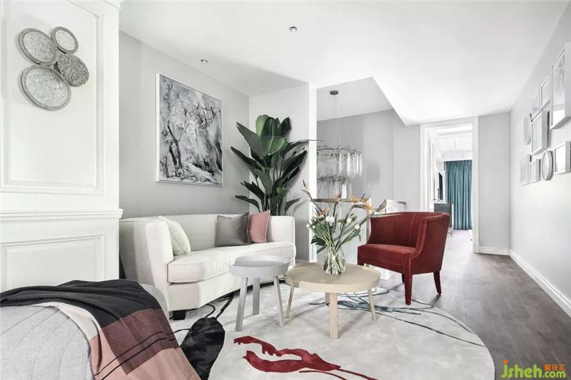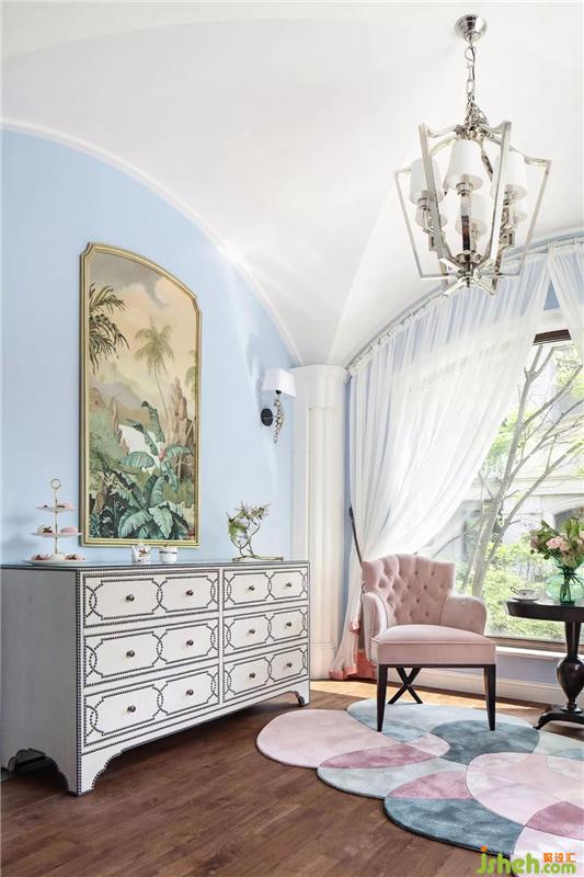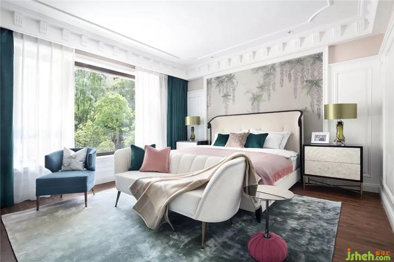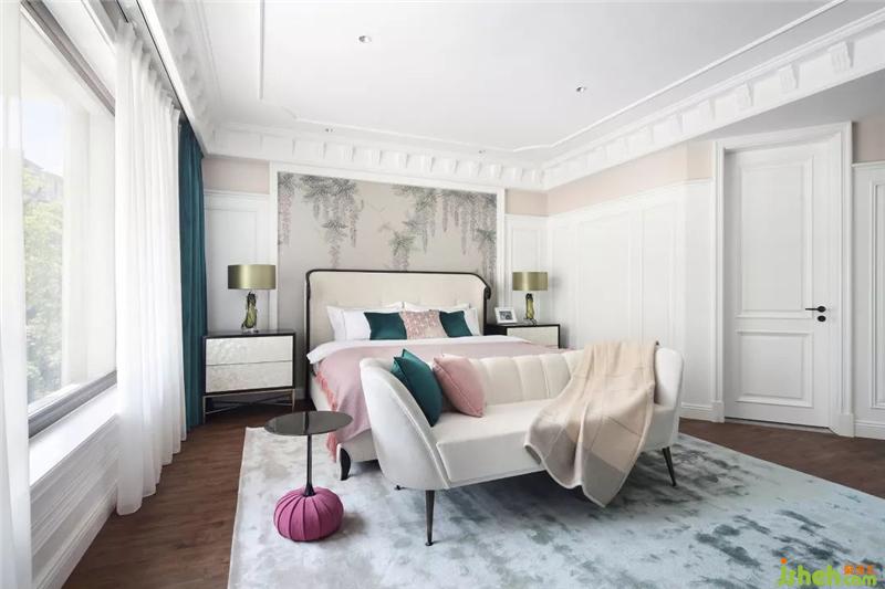 主卧,色彩浪漫恬淡,清新可人,营造出宁谧自然的氛围,温柔熨帖,又慵懒随性,墙面上垂泻下来的紫藤萝瀑布,像一个浪漫甜蜜的紫色梦境。