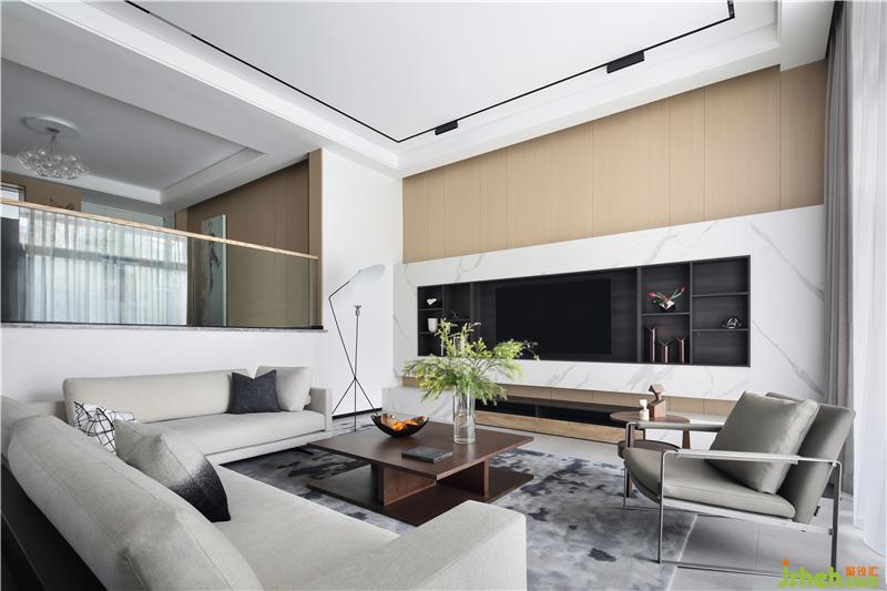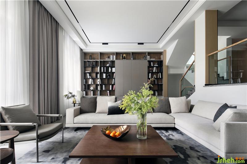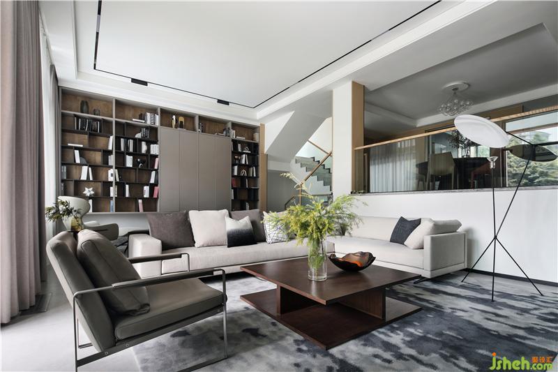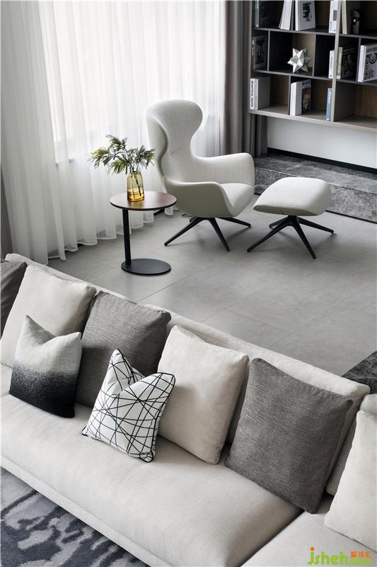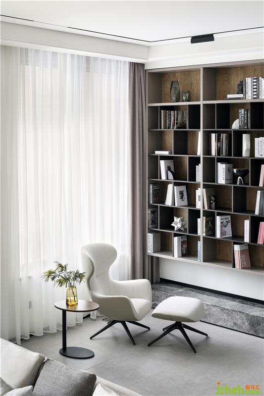休闲厅为客厅的补充空间,位于楼梯平台旁,沉稳质感的书柜铺满整面墙,如源头活水般浸润着整个空间,正是“书卷多情似故人,晨昏忧乐每相亲”。