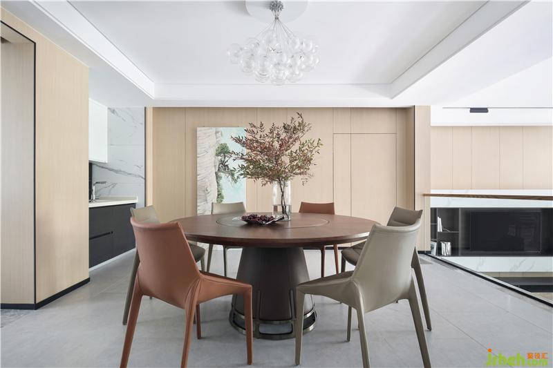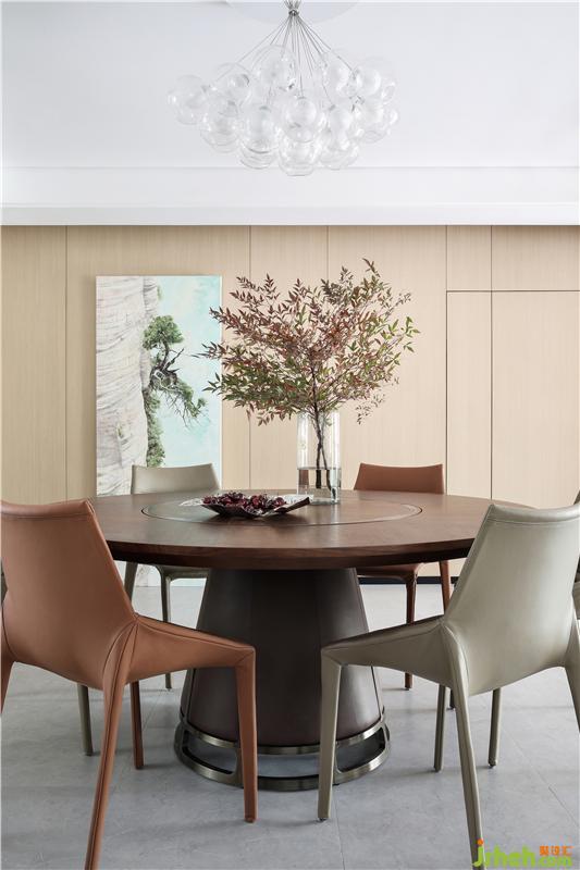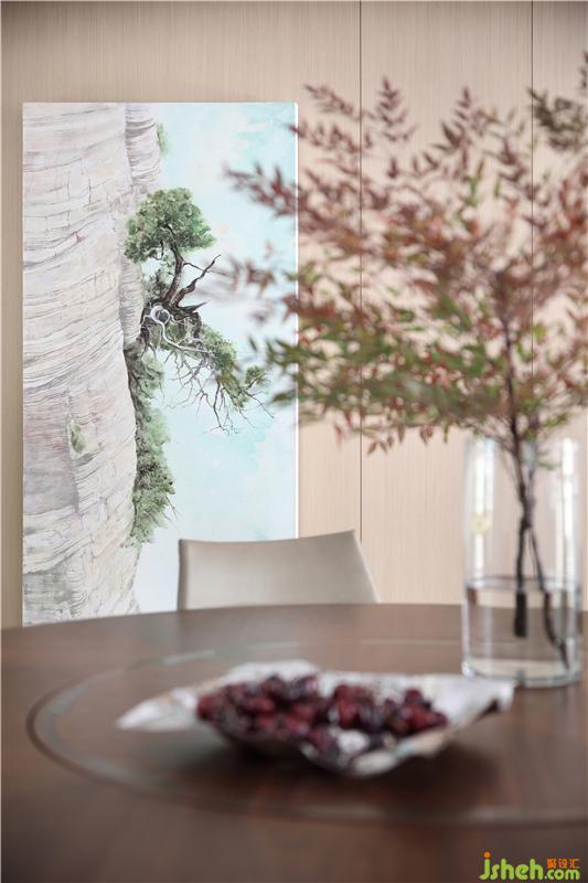 原木材质的家具,油画中遒劲的峭壁苍松,餐桌上的疏影横斜的瓶盏,自然质朴,在浓淡相宜的雅致中,愈增清新与活力。