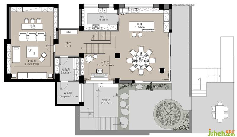 设计师打破常规,在设计中把西厨、餐厅移到了负一楼,将一楼原有的分散空间进行了巧妙的整合,化零为整,使得空间尺度得以放大,视野开阔通透,低调质感的家具点缀其间,克制典雅。