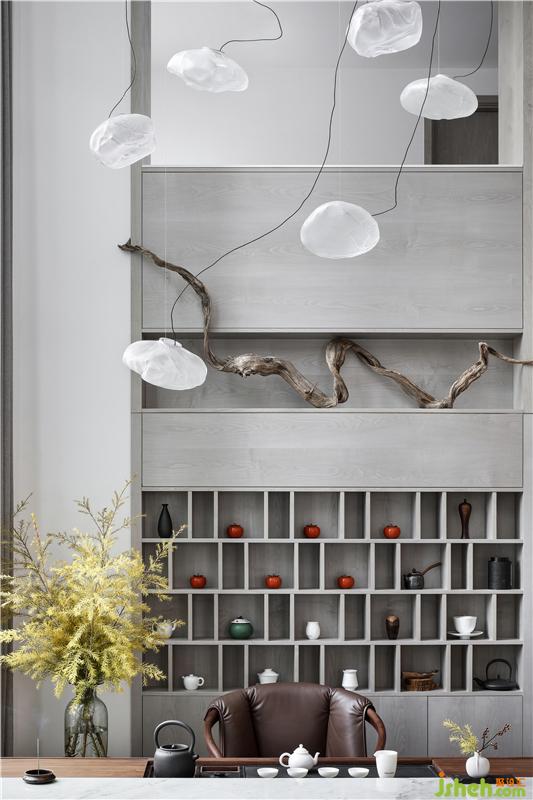 挑高的茶室,依势设景,置入设计师个人收藏多年的崖柏,苍劲飘逸,鬼斧神工,与整个空间浑然天成。云朵造型的Bocci吊灯,溢出枝桠,轻盈空灵,仿若置身云端。