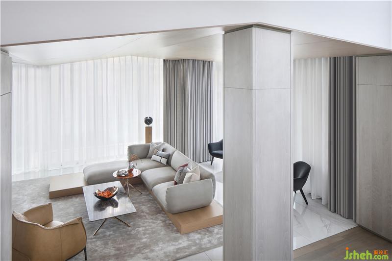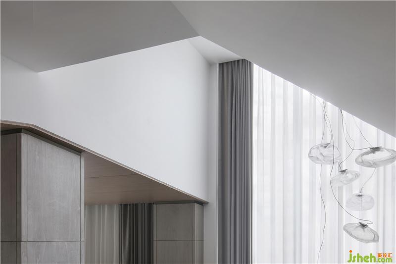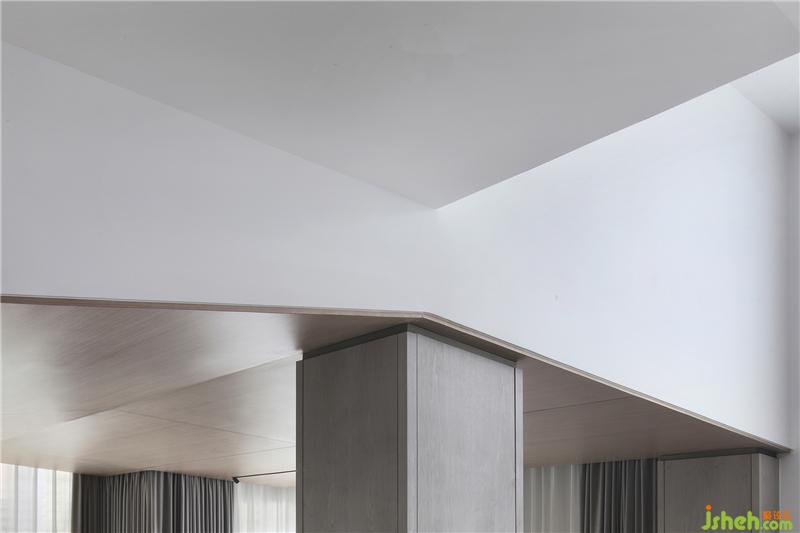 在本项目的空间中,直角折线将冷暖融会平衡,谱写出和谐的旋律,使空间形成内在统一的浑融秩序。钝角折线则试图冲破发出强音,却终因内质的柔和而趋于悠扬,打破空间和谐秩序的同时,让空间变得富于润度。当今时代“拟物”审美的催生、极简风的盛行都离不开人们重新审视自然的眼光。返璞归真、回到物本身……都不仅仅再是一个口号,而是空间迫切需要灌注的养分。空间本身就有着自己的呼吸开阖,一呼一吸,无拘无束,自然而然。 理性严谨的客户喜欢天然的木质材质,没有现代的奢华感,充满温暖。设计师因此在空间中运用了大量的原木元素:木质屏风、沙发底座、台灯底座、木质楼梯、木质版画、木质方几……无不流露出浓郁的自然雅韵。