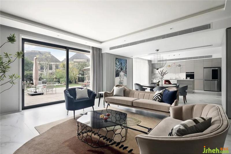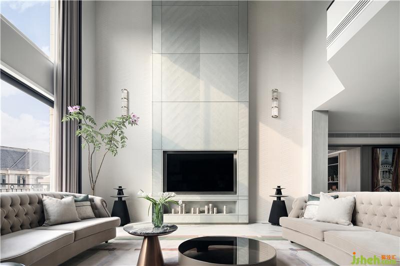 位于一楼的客厅汲取古典对称之美,打造出属于自己的空间秩序。高大的落地玻璃窗,将自然光线一览无遗地引入到室内,使室内可以酣畅沐浴自然光线的馈赠,高大开敞的空间格局,让处在其中的人也获得了一种开阔爽朗的心境。