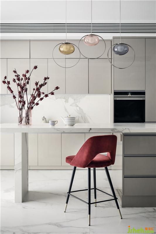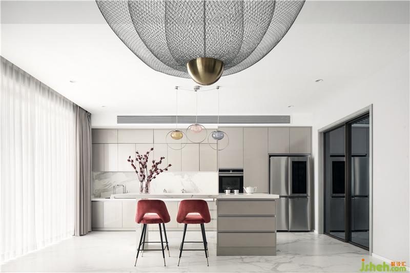 整个项目的施工落地进行了三年之久。设计师对空间进行了合理的优化与改造,将清雅别致的家庭厅与简洁明快的西厨贯通一体,大气舒朗。自然光从门外肆意洒落进来,更增室内的开阔通透之感。墙上挂画艺术品来自王念东的《Hello City》,勾勒女性的自然线条,为空间添以艺术笔触。