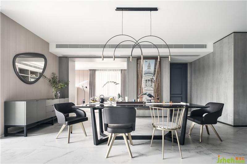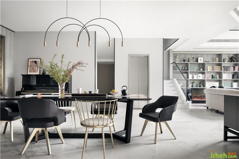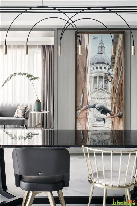 开放式茶室,与客厅连通,选用质感十足的黑金作为主色调,营造一方惬意的品茗修心之地。王念东的画作《圣殿前的跨越》,在色系上与整个空间相呼应,画面的动感使空间的韵律别具一格。