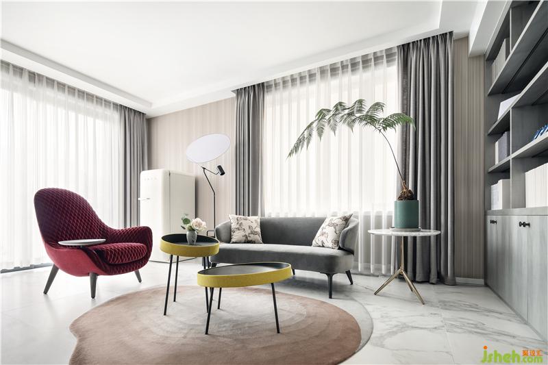 同样位于一楼的家庭厅,在色块的选用与比例上颇具匠心,红色的单椅沙发显得格外亮眼。金毛狗蕨盆栽氤氲着“山抹微云”的古典意境。