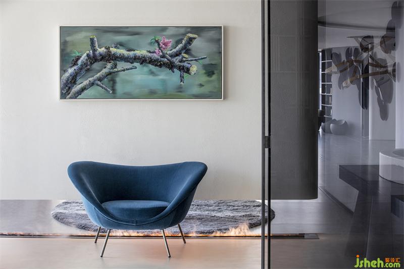 △《Yggdrasill》800×100cm 综合版画,2020,CJ Zhang座椅|Horm Casamania,沙发|Bonaldo,地毯|AKIA