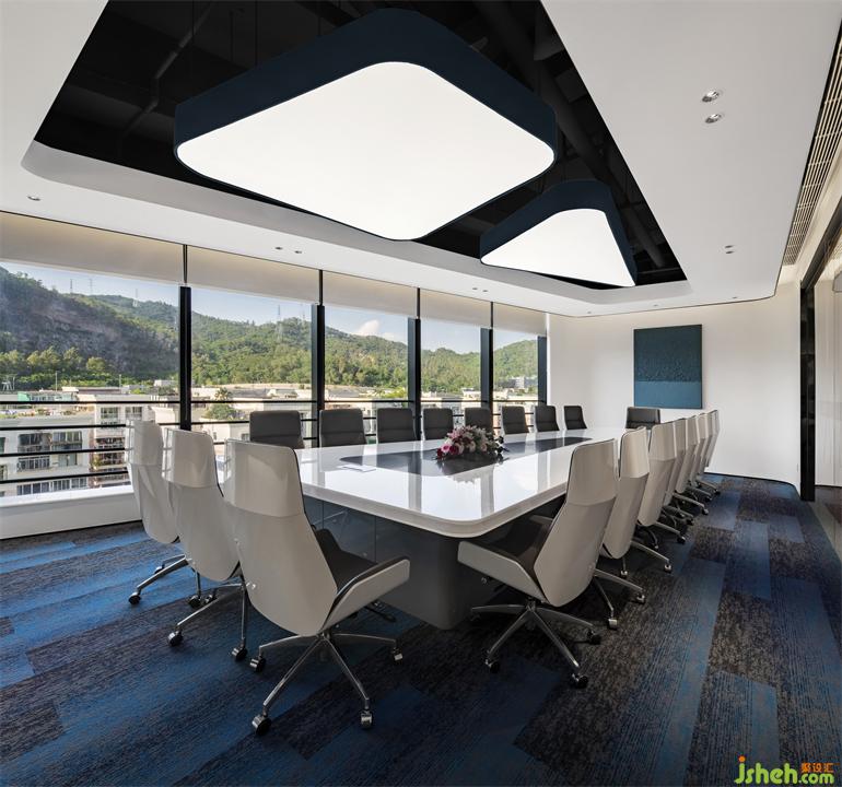 中型会议室利用了斜向空间的造型特点做梯形的天花做法。创造性的用两组异形的发光灯片,巧妙布局、时尚酷炫。