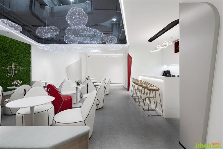 公共通道大面积的使用白色,洁净时尚,充满未来感。局部的圆形造型呼应着公共空间的造型要素。
