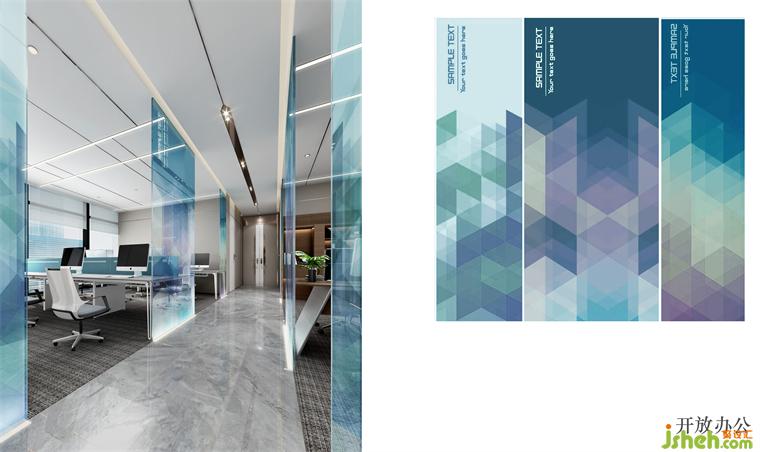 办公区的走道两侧利用艺术的玻璃作为隔断,空间层次分明,艺术图案的冷色调点缀其中,形成中轴景观。
