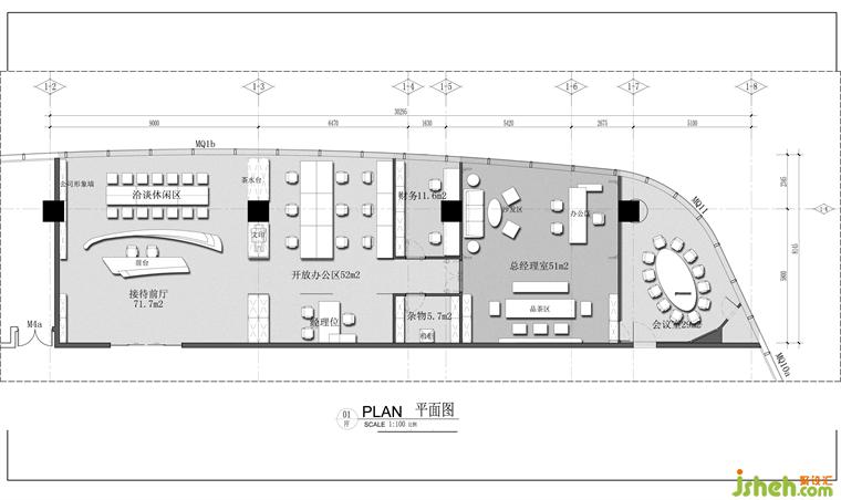 办公空间设计作为闭合的独立空间,总裁办的设计采用天花和墙面的弧角作为造型的处理。个性灵动,三个分区各自独立互不干扰。使用效率很高。