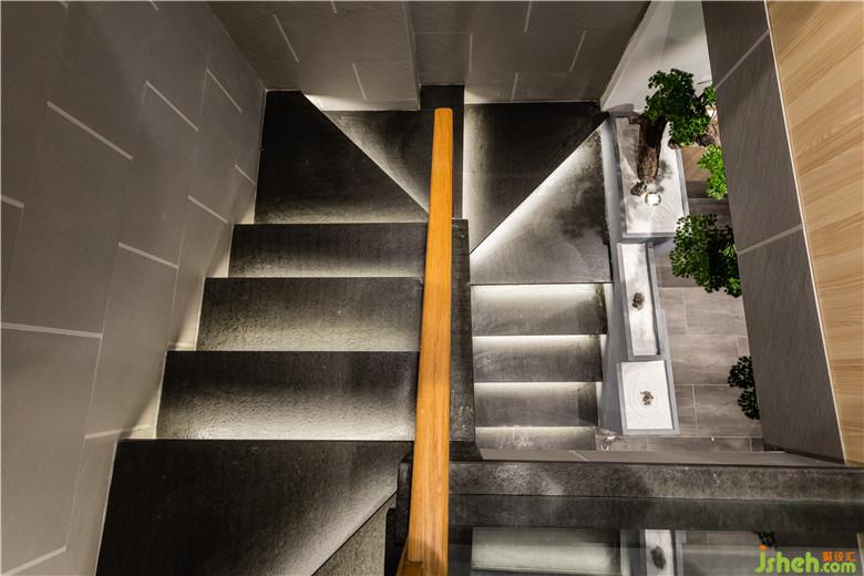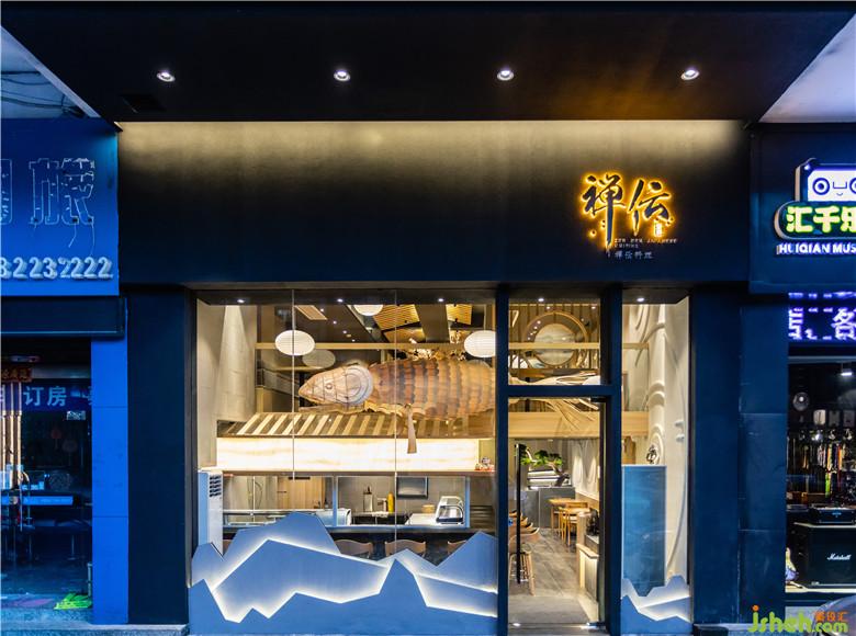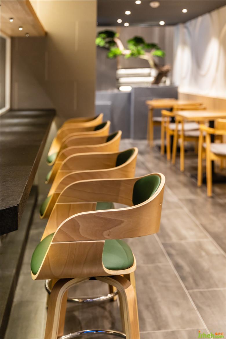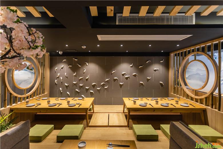 厨房主要放在一楼区域,然而用餐区域也主要放置在二楼。为了展现日式料理的新鲜感,在最亮眼又挑空的位置采用了一条巨形的鱼形竹雕作为这餐厅的主题,而走廊的小餐区墙面上也因为鱼的关系造成了一幅水波墙,在这美轮美奂的鱼池边上也少不了哪棵笑面迎人的迎客松。