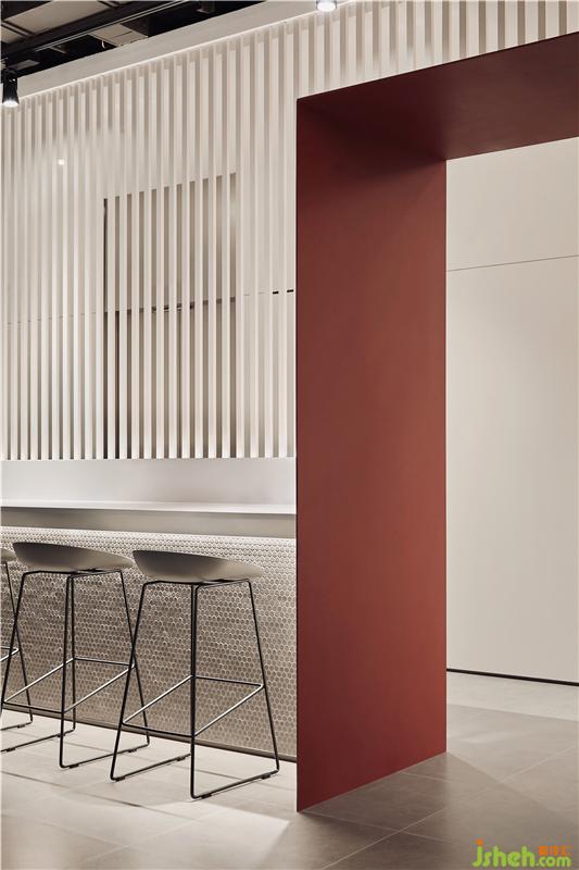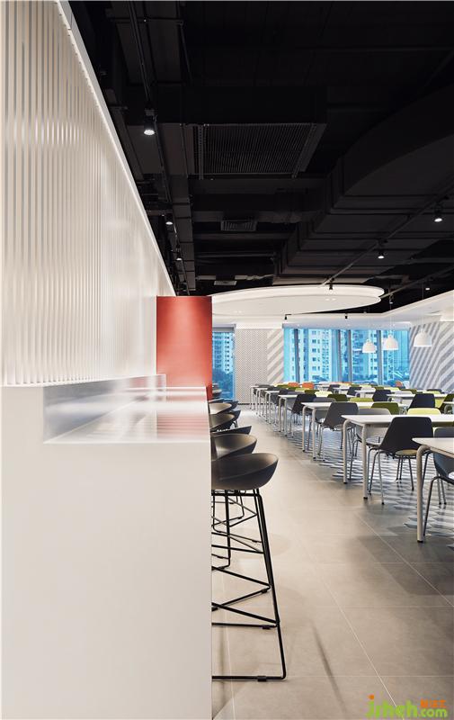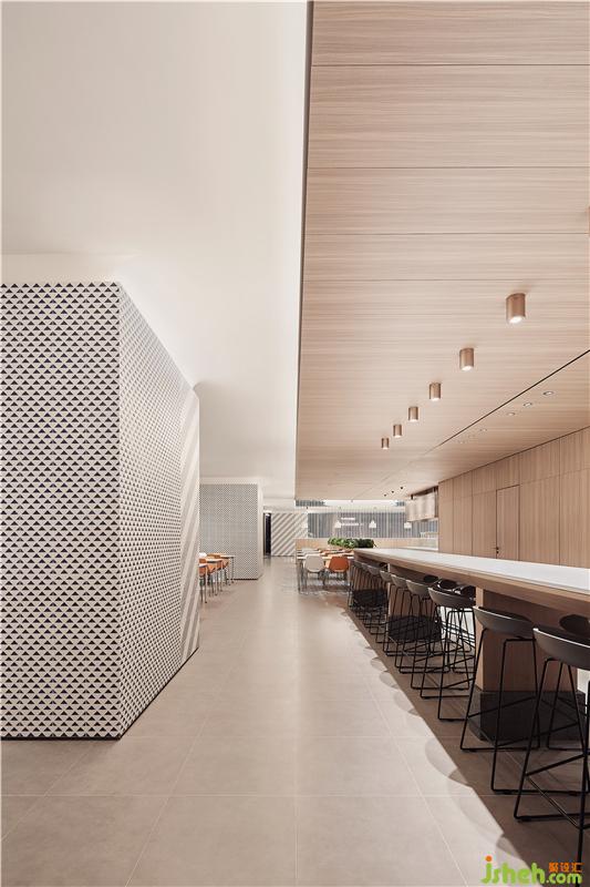 平面构成的元素弱化了原有柱网的体量,在空间中形成了隔而不透的装饰墙的效果。序列感的线条与活泼的基调并没有自乱阵脚,反而萌发出微妙的契合。餐厅设计