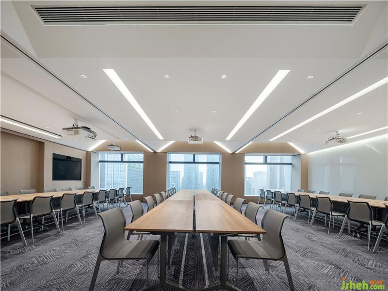 空间内零星分散了小型会议、组合会议、视频会议等不同等级的会议室及会议系统。会议室内的灯具都做了防眩光处理,风口做了散流口的处理,提升舒适感的同时减少了会议打扰。