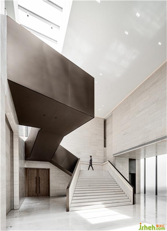 我们延续建筑“雕琢而现”的手法,利用大块面强调出重点空间,将室外纯净的形体关系延续至室内,流转的动线让场所更加丰富。现代的建筑语汇构建了空间通透、自然的格调。在高达10米的神圣尺度中,雕塑感极强的室内楼梯成为空间中震撼的艺术装置。楼梯贯穿起两层,成为岭南历史走向现代文明的转换通道。设计结合历史元素和现代理念,完美诠释了城市的发展与人类的精神诉求。