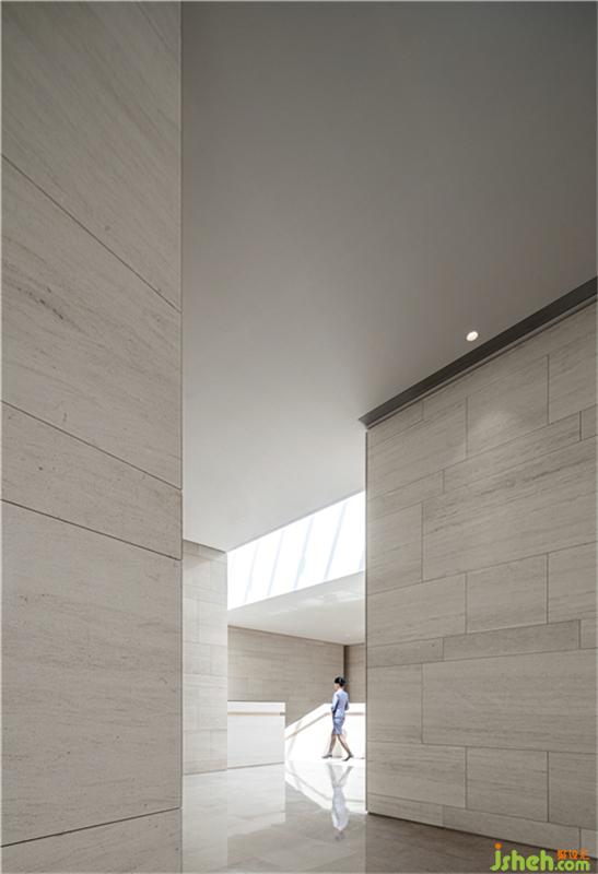 光影以极强的序列感,奏响起空间的前奏。自高处而下的光线使得墙面上的艺术品像漂浮于空中。自然光线透过天窗和结构梁,空间中的墙和地板仿佛瞬间消融,为展示区留下了完美而纯净的背景。