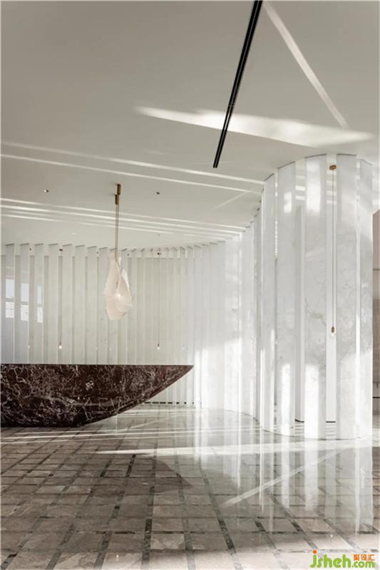 天津销售中心设计师通过精确计算空间比例,将每一片玉石以恰到好处的弧度相互间隔,塑造出千回百转的理性序列之美。片与片之间固定角度的旋转与错开,在空间中形成了极具秩序感的艺术渐变,当光线穿透薄片,一束束白色的平行间隙创建出多个包容性维度,便定格了每一瞬间的流溢美感,纯粹而清澈。