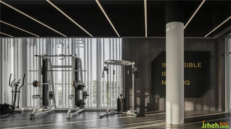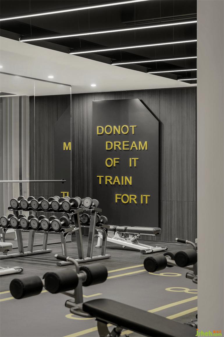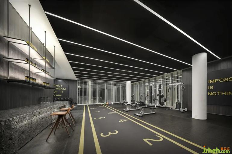 我们洞察健身运动者的心理审美 ,广州售楼处设计开放式器械区、跑道,以光带作为线索沿着墙体、天花对场地切割错置与叠加,展开一场先锋式的运动、稳定、灵感、激荡的拓展感受。