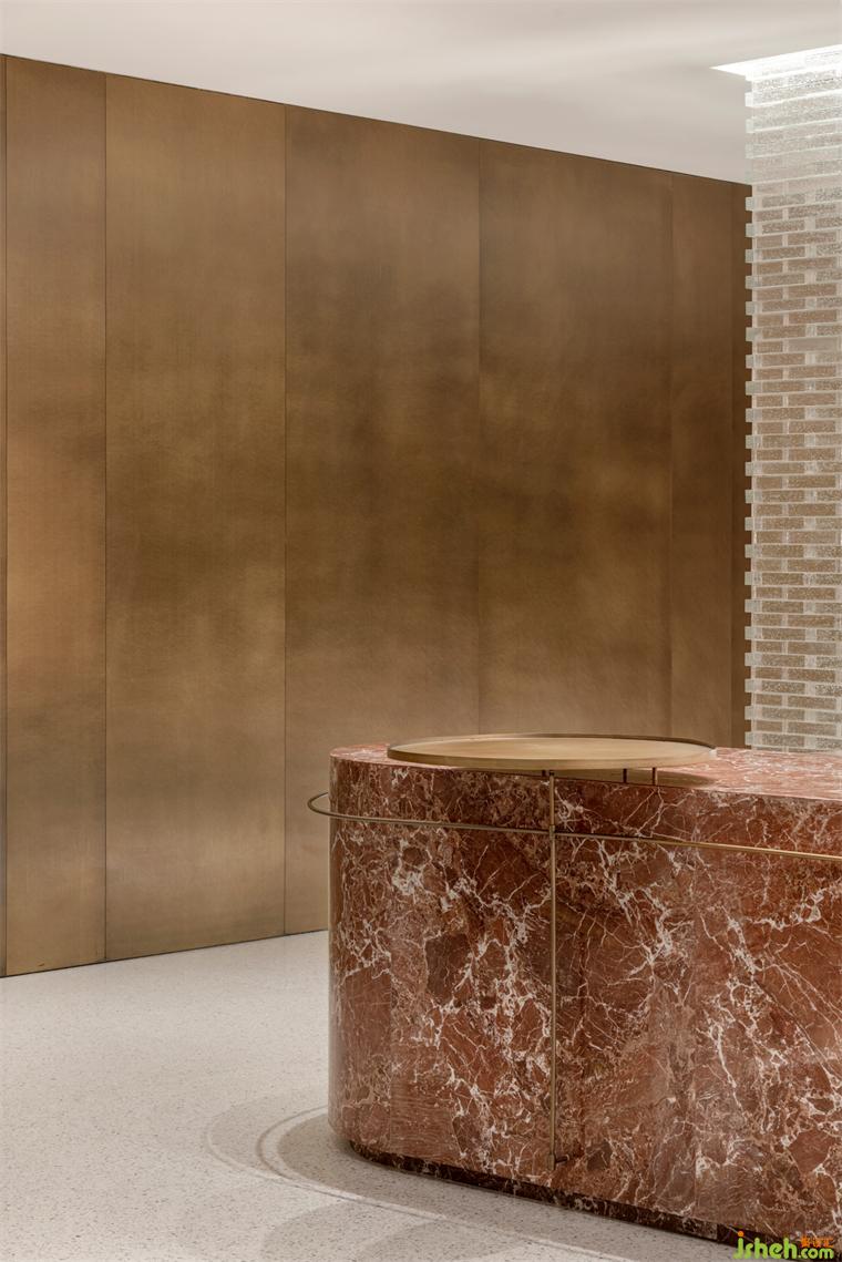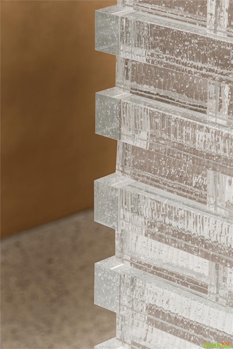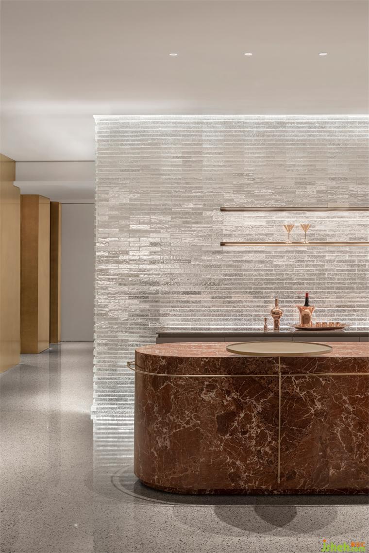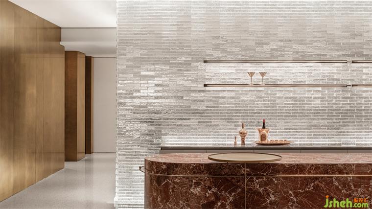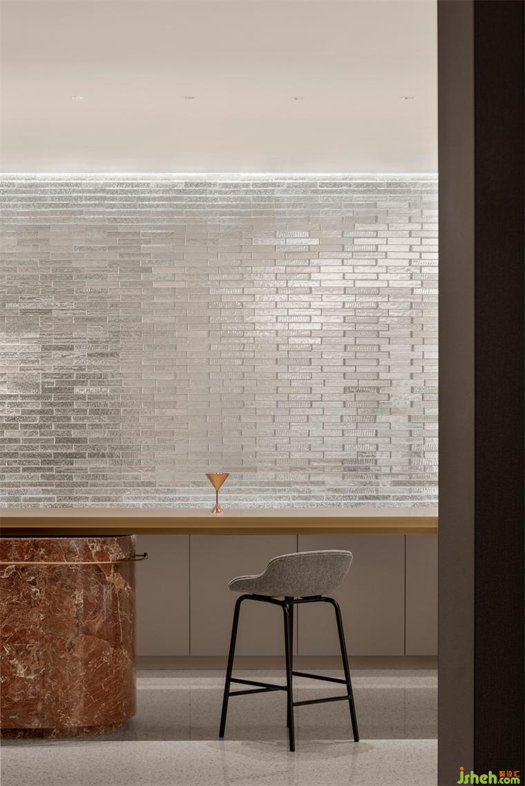 为了突破全室内的封闭感,入口迎宾及吧台背景墙利用玻璃砖层叠排布形成光的棱镜效果,装修设计若隐若现的剪影透射而出,隐而不盲、藏而不喧。