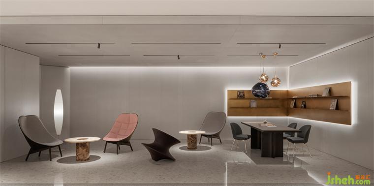 为了满足不同需求的到访会员各种交互需要,这里硬装背景退居留白,装修设计家具配饰占着据绝对主角。
