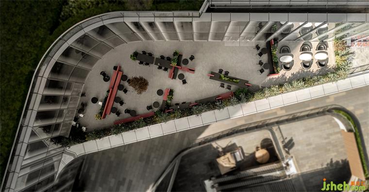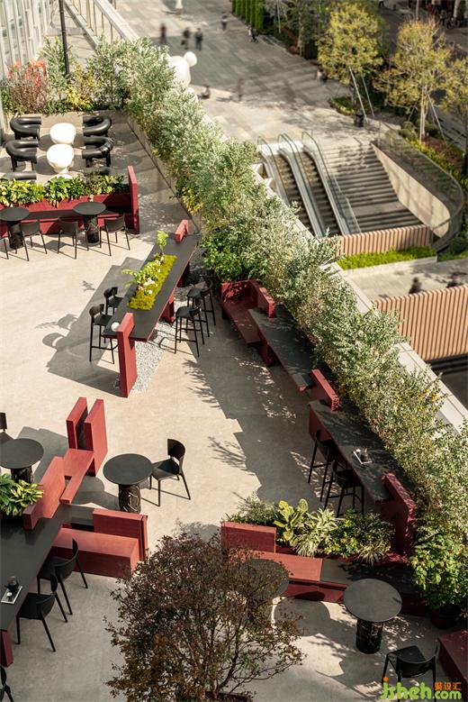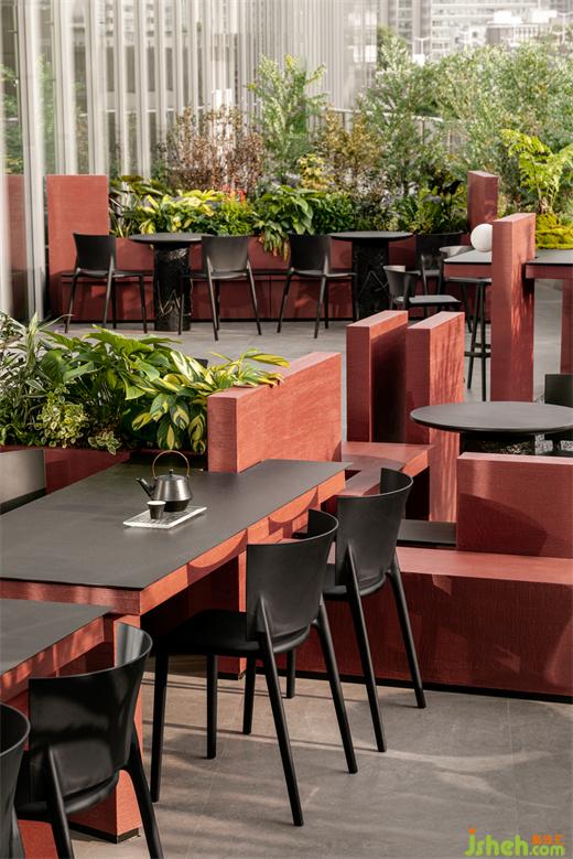 榫卯模块围合的三角场地与室内架构贯通。这里的造型低矮且灵活,茶楼设计落座的同时又具墙体的隔断功能。