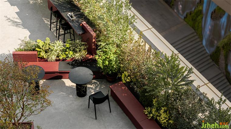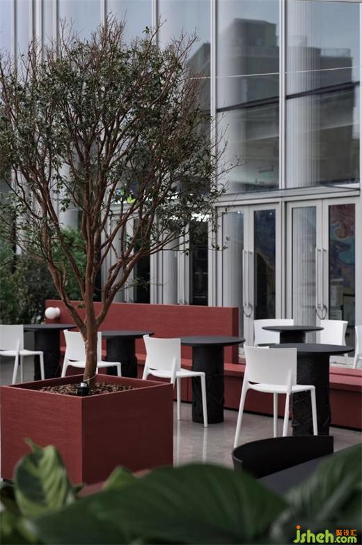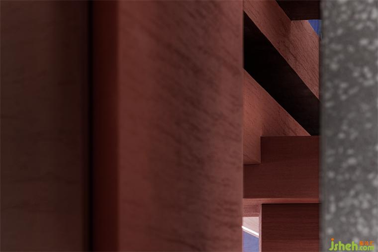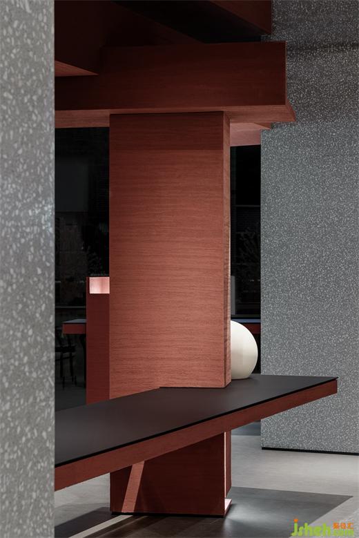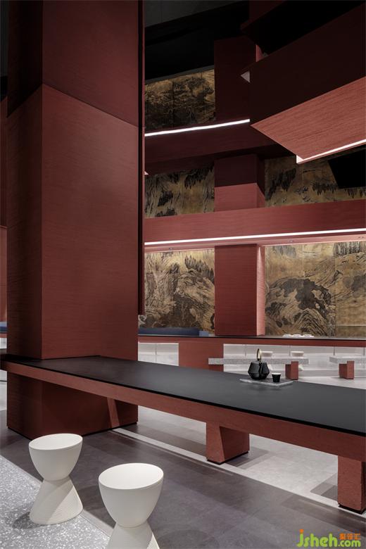 风化红壤土斑驳的纹理充满岁月古老的粗糙感,从触感、观感都完美复刻了土壤的风化断层面。茶楼设计火山黑岩板与之形成意象色彩冲突,重现着古老的自然演化过程。