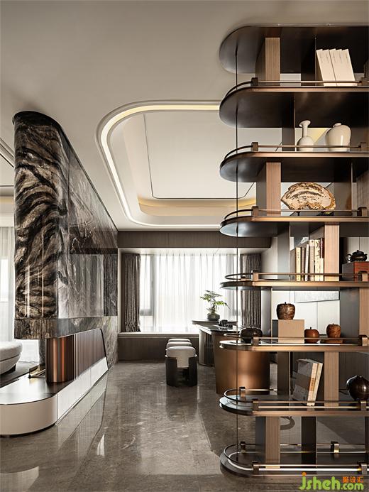 天然奢石如山水流动般,尽显雅奢格调,与展示架檀木藏品相得映彰,样板房设计既能展现出主人公的日常及爱好,又能仔细品味生活的美学所构建的安谧。