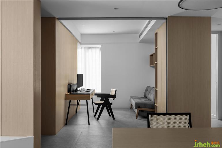开放式的书房,沉溺在木色书香之中。为了尽量减少门洞的突兀,设计师把书房的门设计成嵌入式、主卧门做成隐形门。门外是人间烟火,门内是闲情雅致。可变的开放式书房,人在工作时,也能随时与厨房、客厅空间的家人交流,呈现了空间与空间的对话,让家人之间的互动性和凝聚力更高