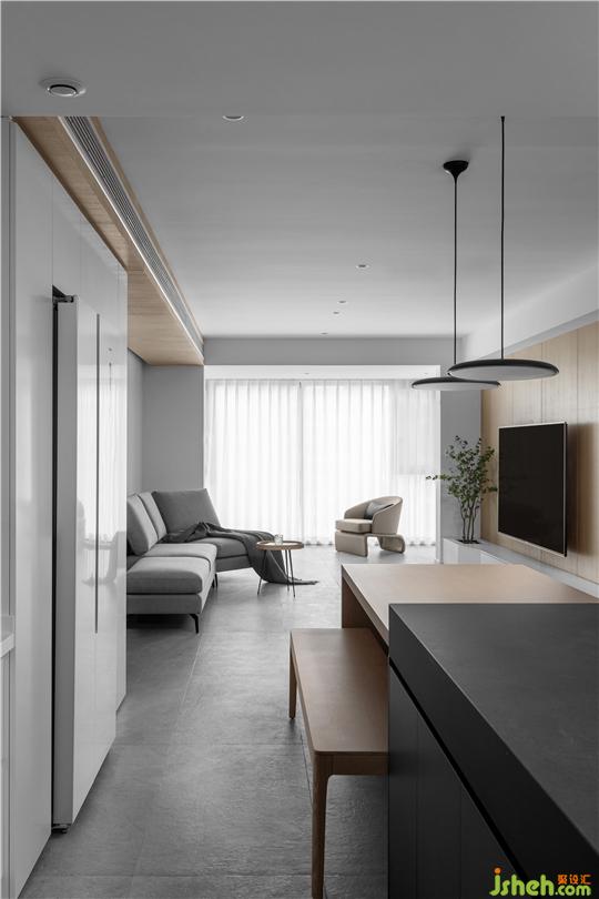 客餐厅简洁的无主灯设计,配上浅灰哑光地砖,整个空间雅致从容。予上空间设计特殊的沙发造型,连接着展示柜和整个厨房空间,凸显空间的延续性和整体性。让生活的节奏和空间变化的节律合拍,让心灵真正得到休养生息。