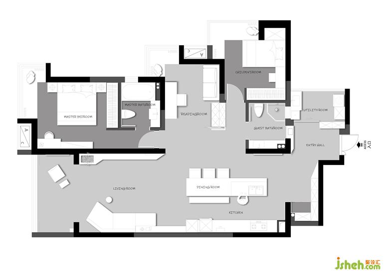 不奢望繁华似锦,只求云卷云舒的清淡,似水一样的舒缓快乐,守一座城池,让精神有所阪依,远离喧嚣,接近清宁。主卧大面积运用柔和的灰色调加上床头留白的装饰画,以自然而然的手法糅合静的基底,让本就简约的空间多了一份精致感。
