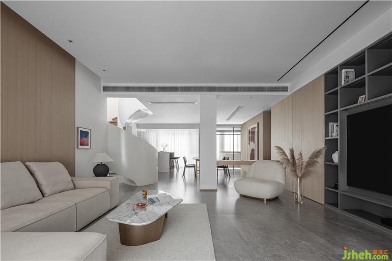 客厅空间采用自然简洁的木质墙板设计,优雅的色调营造出明快温馨的气质,充足的自然光线带来独特的光影变化。我们利用客厅空间保留的柱体通过巧妙的改造,将其得到利用,完美的掩盖了原空间布局的瑕疵,使得客餐厅空间视野变得无比开阔的同时,又赋予空间包裹性,趣味性十足。